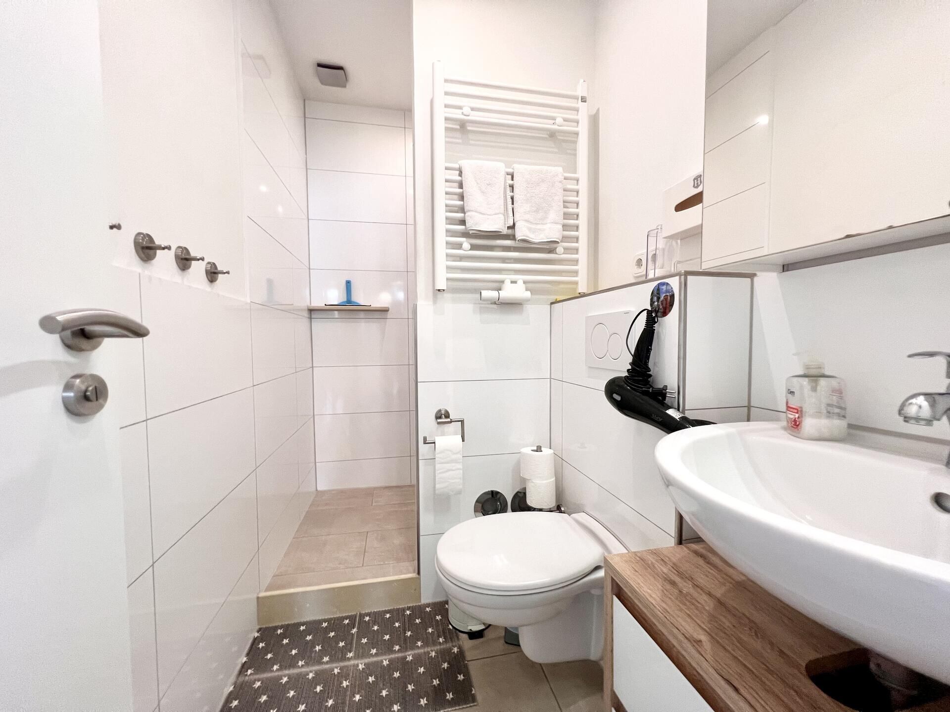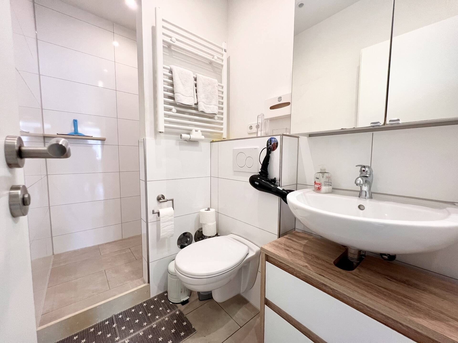 Das Badezimmer ist mit allem ausgestattet, was du für einen angenehmen Aufenthalt benötigst. Es bietet dir einen Haartrockner, Duschgel, Shampoo sowie frische Handtücher und Badetücher. Jedes Detail wurde sorgfältig ausgewählt, um dir ein Höchstmaß an Komfort zu bieten und sicherzustellen, dass du dich in meinem Londoner Apartment wie zuhause fühlst.