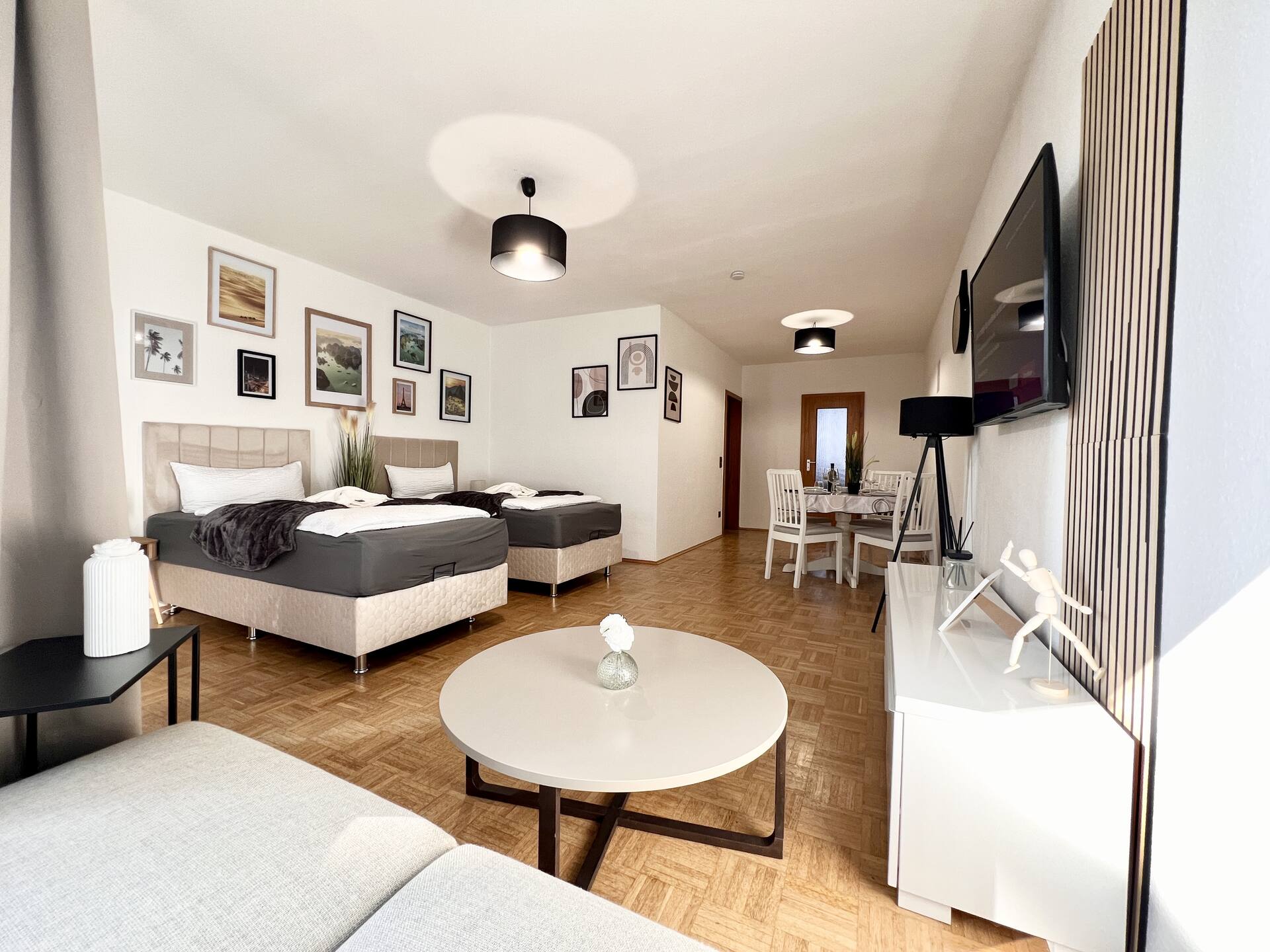 Komfortable Ausstattung: Zwei Schlafzimmer mit bequemen Betten, ein gemütlicher Wohnbereich mit Smart-TV und eine voll ausgestattete Küche.